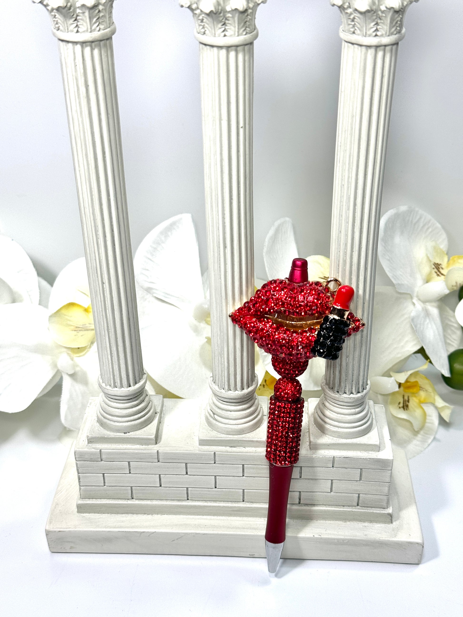 "Add a pop of glam to your writing with our one-of-a-kind Handmade Pens rhinestone red lipstick lips pen! This fun and flirty pen sparkles with style, making it a unique gift for fashion lovers who love a touch of shine."