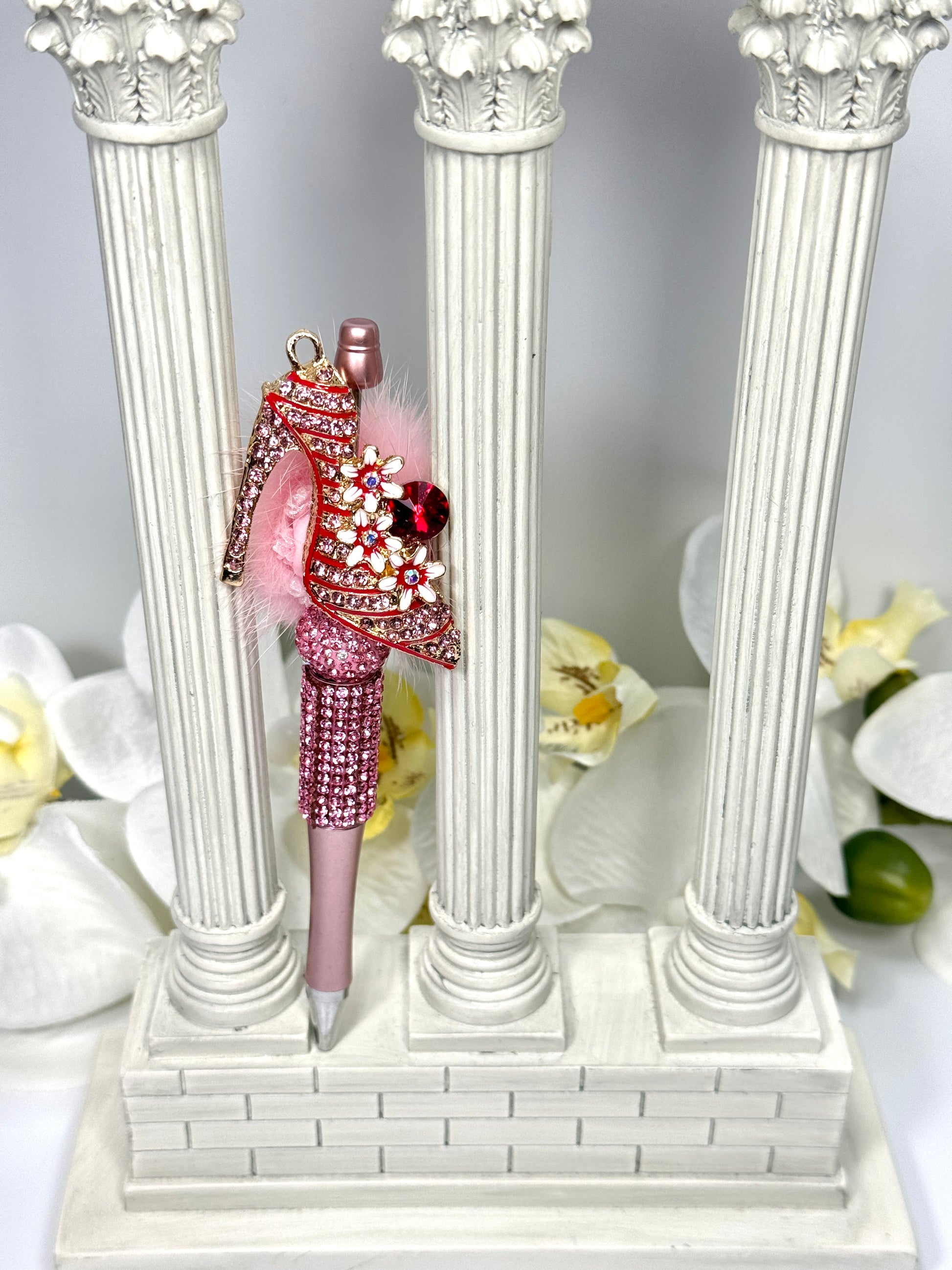 "Step up your writing game with our one-of-a-kind handmade rhinestone pink high heel pen! This fun and sparkly pen is perfect for those who love a pop of style and flair. A unique gift for fashion lovers!"