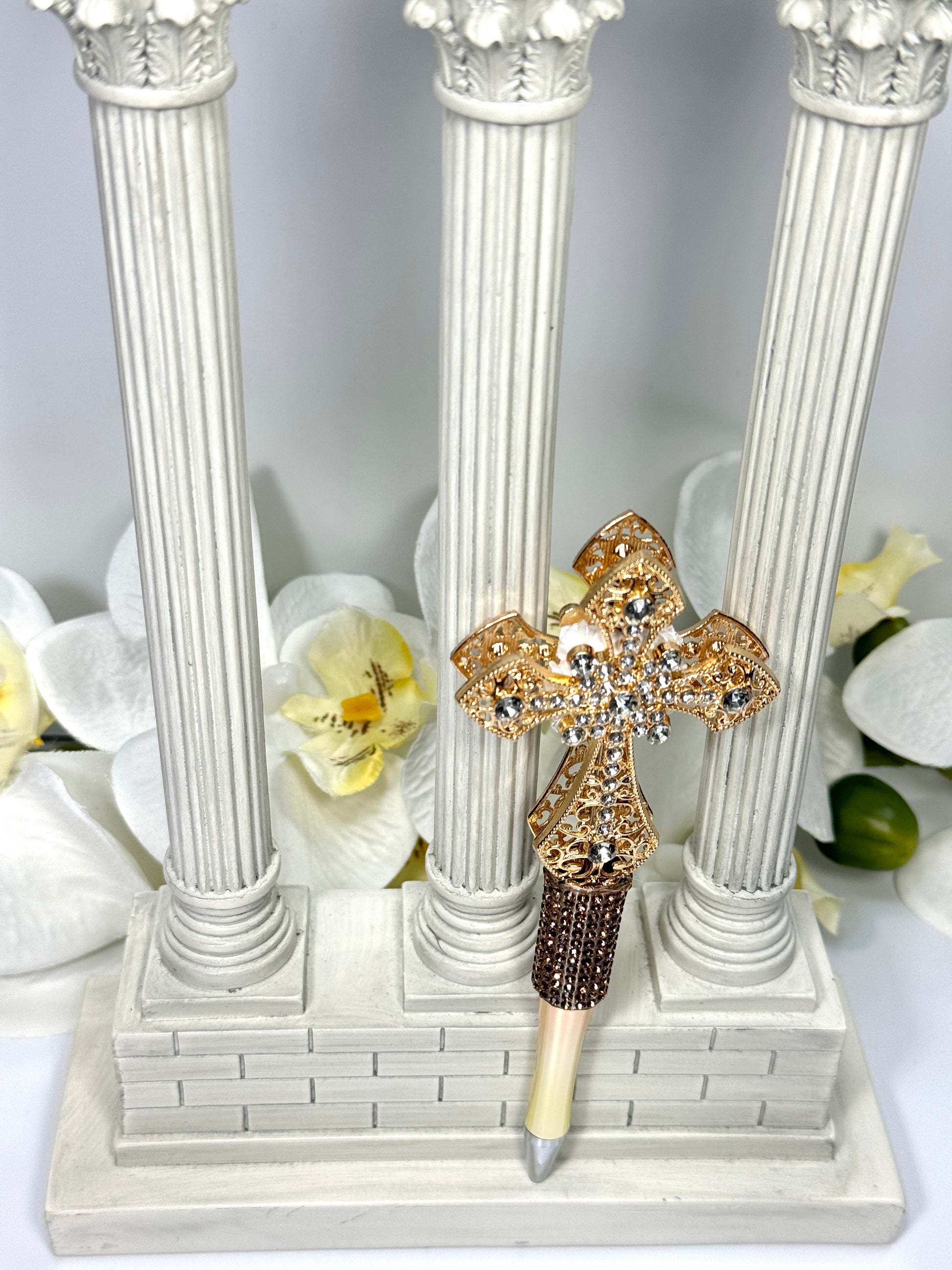 "Write with elegance using our one-of-a-kind handmade rhinestone gold-colored cross pen. This stunning pen shines with sophistication, making it a meaningful and unique gift for any occasion. Perfect for adding a touch of grace to your writing!