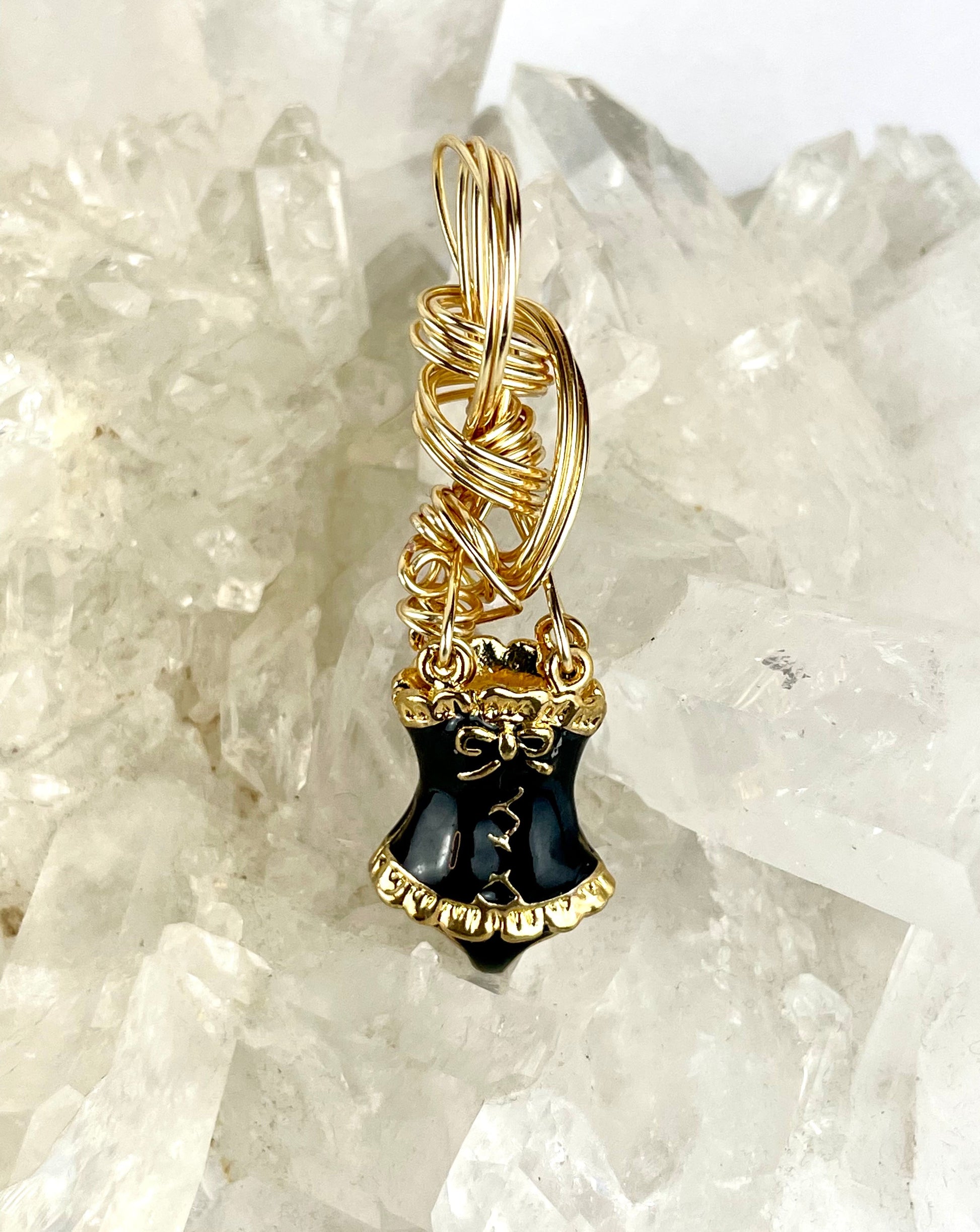 "Indulge in opulence with our Gold & Black Corset Wired Wrapped Pendant, a true testament to timeless elegance. Meticulously crafted with non-tarnishing wire, this pendant marries the richness of gold with the bold allure of black. The corset design adds a touch of glamour, making it a unique statement piece for the discerning wearer. Elevate your style with this handcrafted pendant, a harmonious blend of contemporary sophistication and classic charm. Ideal for those seeking distinctive accessories that radiate individuality and grace. Embrace the beauty of craftsmanship and make a statement with our Gold & Black Corset Wired Wrapped Pendant."