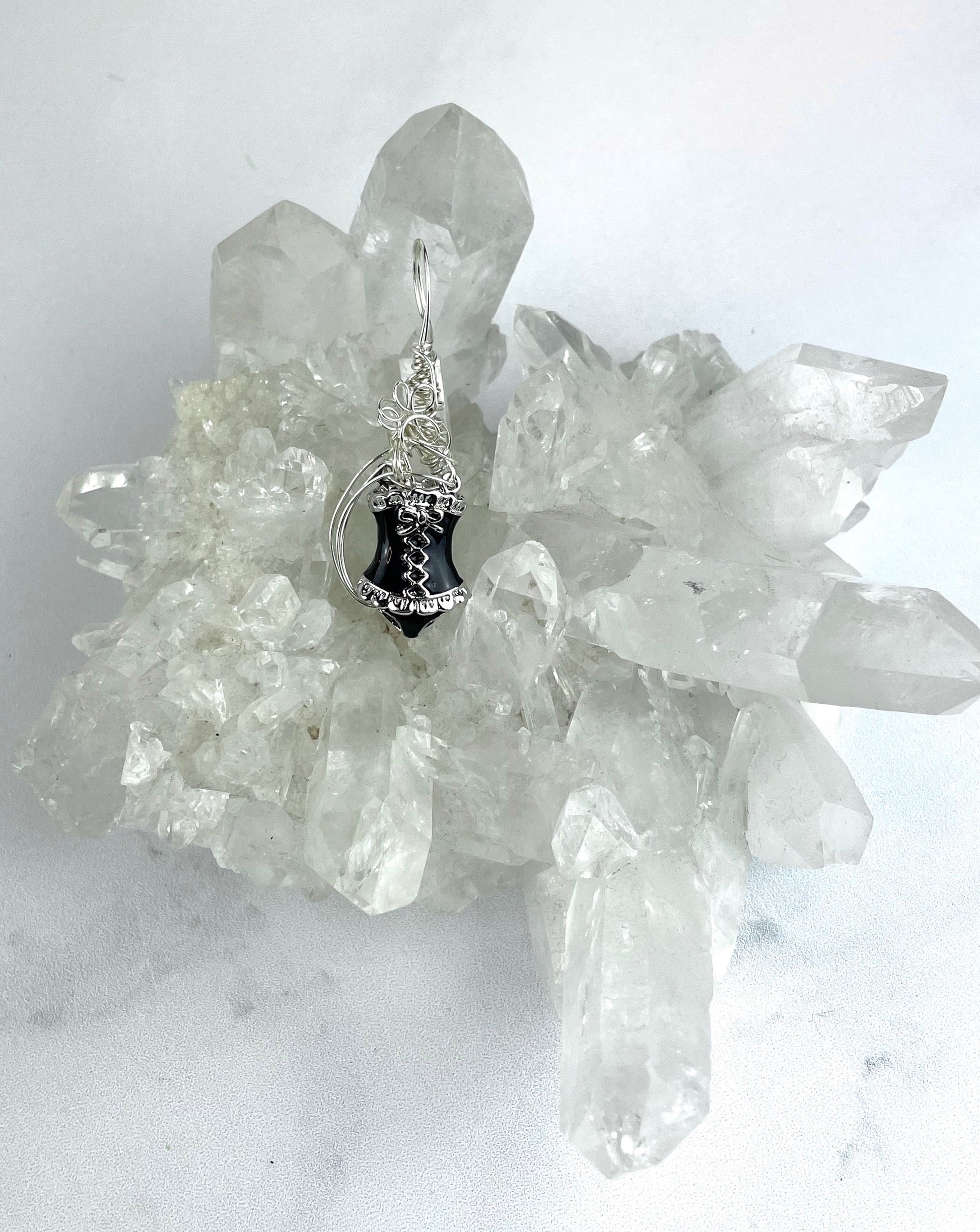 "Introducing our stunning Silver & Black Corset Wired Wrapped Pendant, a masterpiece of artistry and elegance. Meticulously crafted with non-tarnishing wire, this pendant showcases the perfect fusion of timeless silver and bold black elements. The corset design adds a touch of sophistication, making it a unique statement piece. Elevate your style with this handcrafted pendant that effortlessly blends contemporary fashion with classic charm. Ideal for those seeking distinctive accessories that resonate with individuality and grace. Embrace the beauty of craftsmanship and make a statement with our Silver & Black Corset Wired Wrapped Pendant."