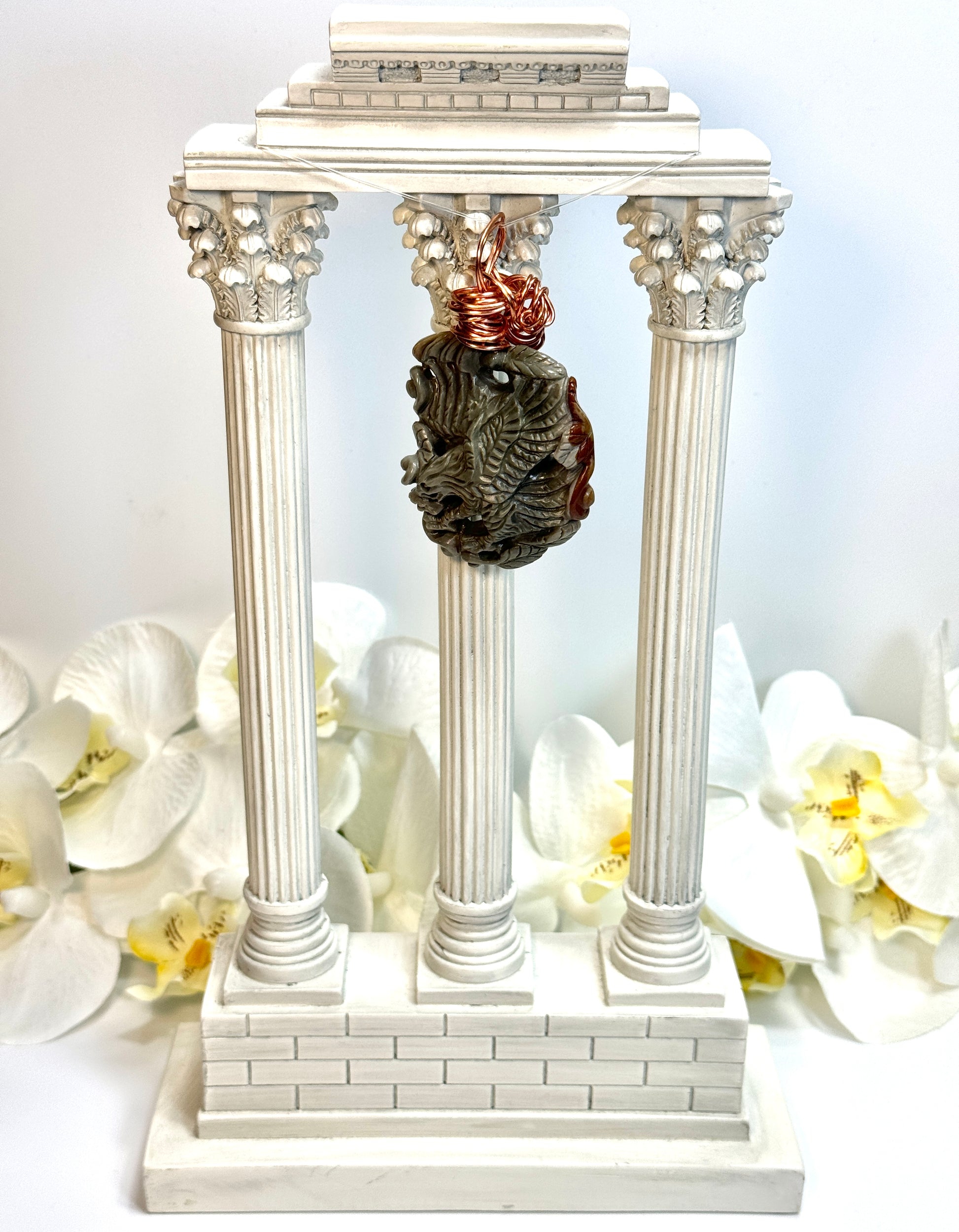 Ignite your style with our Jasper Carved Phoenix pendants, a mesmerizing fusion of earthy elegance and mythical allure, skillfully embraced in a copper wire wrap. This unique piece showcases a hand-carved Jasper Phoenix, symbolizing renewal and strength, encased in the warmth of copper craftsmanship. Elevate your jewelry collection with this Copper-Wrapped Jasper Carved Phoenix, a symbol of resilience and bold sophistication.