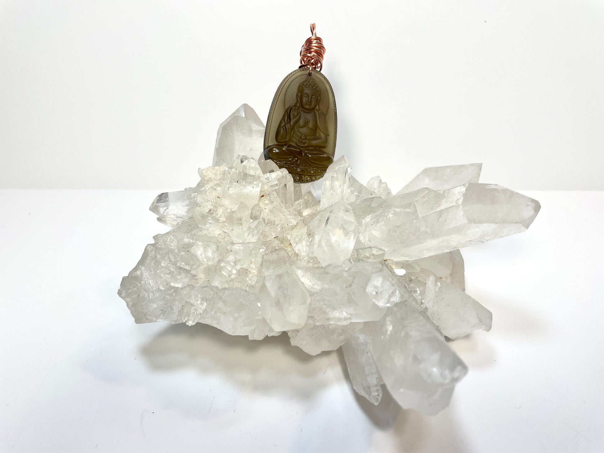 Discover serenity in our Smoked Glass Buddha pendants, an embodiment of tranquility and artistry. This exquisite piece features a smoked glass Buddha suspended gracefully within a copper wire wrap with modern design. The translucent allure of the smoked glass captures the essence of wrapped copper adds a touch of warmth and grounding energy.