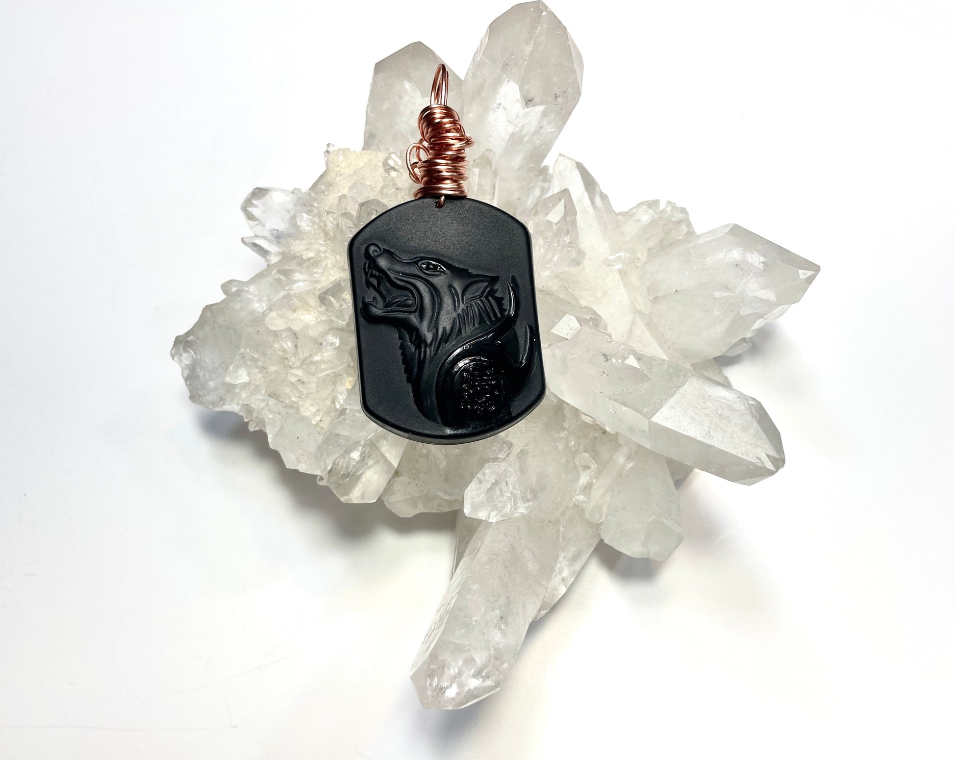 Unleash the wild elegance of our pendants, Obsidian Carved Wolf pendant, a captivating harmony of strength symbolizing instinct, loyalty, and courage, encased in a copper wire wrap. Elevate your style with this Copper-Wrapped Obsidian Carved Wolf, a powerful talisman for those who embody the spirit of the wild.