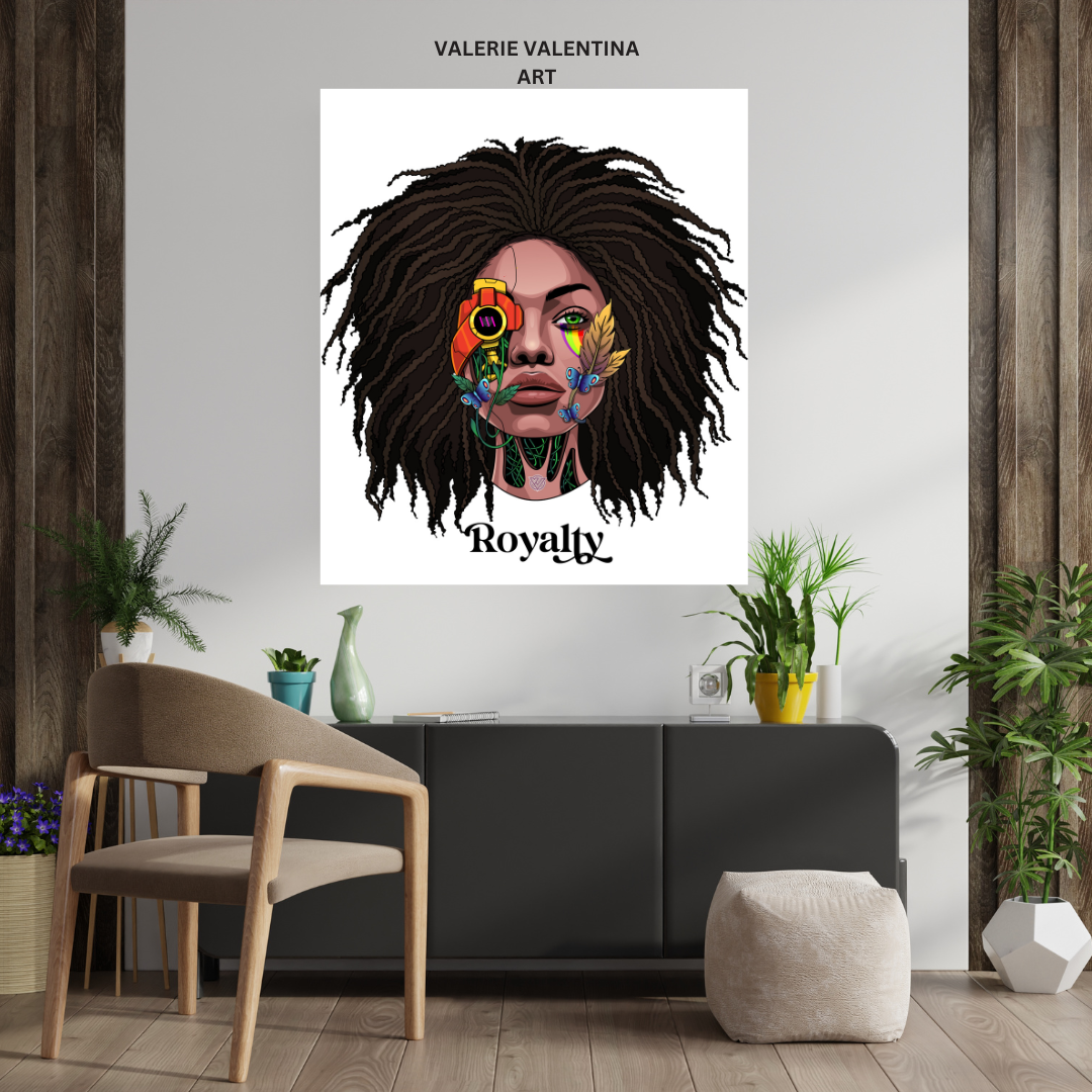 "Introducing 'Mother,' a captivating masterpiece that beautifully encapsulates the regal essence of a black woman with dreads. She embodies the roles of devoted mother, loving wife, and successful businesswoman, radiating strength and grace. This artwork is a celebration of the multifaceted identities of black women, their resilience, and their regal presence. 'Mother' is a visual ode to the majesty of black queens, honoring their wisdom, beauty, and entrepreneurial spirit. Explore this empowering piece, an artistic representation of modern-day royalty, and pay homage to the remarkable journey of strong, empowered women.